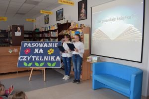 13 maja uczniowie klasy pierwszej zostali uroczyście przyjęci do grona czytelników Biblioteki Szkolnej w Kluczewsku. Najważniejszym celem spotkania było zachęcenie najmłodszych uczniów do częstego korzystania z biblioteki oraz rozbudzenie u dzieci zainteresowania książką. Uroczystość poprowadziły przedstawicielki Dziecięco – Młodzieżowego Dyskusyjnego Klubu Książki. Uczniowie obejrzeli prezentację „Jak powstaje książka”, dowiedzieli się w jaki sposób należy dbać o książki i jakie korzyści płyną z ich czytania. Poznali regulamin korzystania z biblioteki i zasady wypożyczania książek.