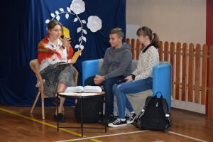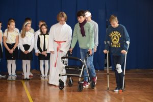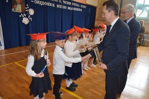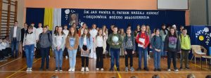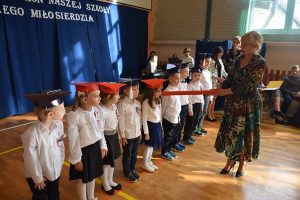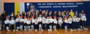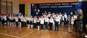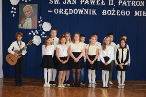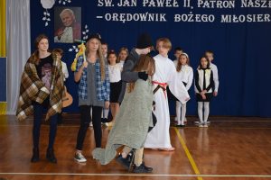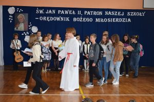 W przedstawieniu pod hasłem „Św. Jan Paweł II orędownik Bożego Miłosierdzia” wystąpili uczniowie klasy VIII, VIb, Vb i IV prezentując wzruszającą historię człowieka, który idzie przez życie kierując się wartościami, jakie wskazywał św. Jan Paweł II. W tym ważnym dla całej Społeczności Szkolnej Dniu uczniowie klasy pierwszej zostali włączeni do braci uczniowskiej naszej szkoły. Po ślubowaniu pierwszoklasiści otrzymali pamiątkowe dyplomy, książeczki, długopisy oraz słodkie upominki.
