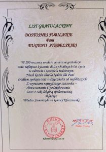 W dniu 15 lipca 2023 r. pani Eugenia Stębelska mieszkanka Ciemiętnik obchodziła jubileusz 100 lat życia, przy udziale najbliższej rodziny, przyjaciół, krewnych, mieszkańców Ciemiętnik, przedstawicieli władz gminnych w osobach – Rafała Pałki – Wójta Gminy Kluczewsko, Justyny Bugały-Piotrowskiej – Skarbnika Gminy oraz przedstawicieli Kasy Rolniczego Ubezpieczenia Społecznego (KRUS). W intencji Jubilatki odbyła się Msza św. w kaplicy pw. św. Jana Nepomucena w Ciemiętnikach, którą sprawował ks. Wiesław Chęcina proboszcz parafii pw. św. Wawrzyńca w Kluczewsku. W homilii duchowny wyraził Panu Bogu wdzięczność za 100 lat życia Pani Eugenii, przywołał kilka faktów z Jej długiego życiorysu oraz wyśpiewał tradycyjne „plurimos annos”. Po Eucharystii na ręce Pani Eugenii popłynęły życzenia, kwiaty i prezenty. Nie obyło się bez wzruszeń, a także pamiątkowych fotografii. Listy gratulacyjne Jubilatce nadesłali, m.in. Prezes Rady Ministrów Mateusz Morawiecki i Wojewoda Świętokrzyski Zbigniew Koniusz. Tego samego rodzaju dokumenty w dniu jubileuszu Pani Eugenii wręczył Wójt Gminy Kluczewsko Rafał Pałka, a w imieniu Prezes KRUS Aleksandry Hadzik – reprezentujący Kierownika KRUS Placówki Terenowej we Włoszczowie pracownicy biura.