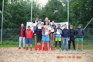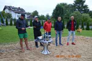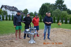 Jednak głównym bohaterem wczorajszej rywalizacji była … deszczowa pogoda, która nie zraziła uczestników, którzy już w sobotę potwierdzili, że będą grać bez względu na przeciwności. I zrobili tak, jak zadeklarowali. Wszystkie zgłoszone do turnieju drużyny stawiły się w niedzielny ranek w Jakubowicach. Tak więc o puchary i nagrody rzeczowe, ufundowane przez Wójta Gminy Kluczewsko, rywalizowało tym razem 15 par. W wyniku uzgodnień turniej rozegrano systemem brazylijskim, jeden set do 21 punktów. W trakcie pikniku organizatorzy przygotowali dla uczestników napoje i gorący posiłek. Wspaniała atmosfera, którą stworzyli sportowcy, sprawiła, że turniej okazał się organizacyjnym sukcesem, a miłe słowa kierowane do organizatorów coraz bardziej utwierdzają nas do realizacji pomysłu, który jeszcze do nie dawna wydawał się przeszkodą, ale o tym wkrótce …