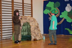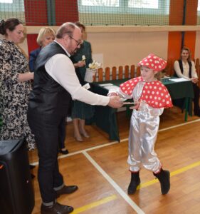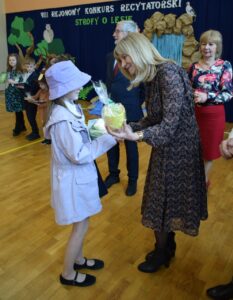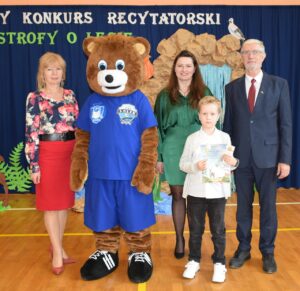Rozstrzygnięcie konkursu poprzedził występ uczniów naszej szkoły, którzy krótkim przedstawieniem pt. „Kłopoty Krasnali” wprowadzili wszystkich w tematykę dotyczącą lasu i jego mieszkańców. Na uroczystość przybyli również goście: p. Sławomir Krzysztofik – Wizytator Kuratorium Oświaty w Kielcach, p. Wioletta Binkowska – Przewodnicząca Rady Rodziców oraz opiekunowie. Następnie laureaci i wszyscy uczestnicy konkursu otrzymali dyplomy z nagrodami. Wydarzenie uatrakcyjnił miś „Loluś”.