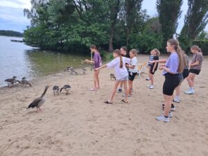 Podczas pobytu w Grudziądzu w niewielu wolnych chwilach udało nam się pospacerować nad pięknym Jeziorem Rudnickie Wielkie i przy okazji odwiedzić „Ptasi Bufet”, gdzie dziewczynki mogły dokarmiać i podziwiać ogromne stada żyjących tutaj gęsi gęgawa. Oprócz spacerów dziewczyny wykorzystywały też walory sportowe ośrodka w którym przebywały i do późnych godzin wieczornych grały w siatkówkę plażową.