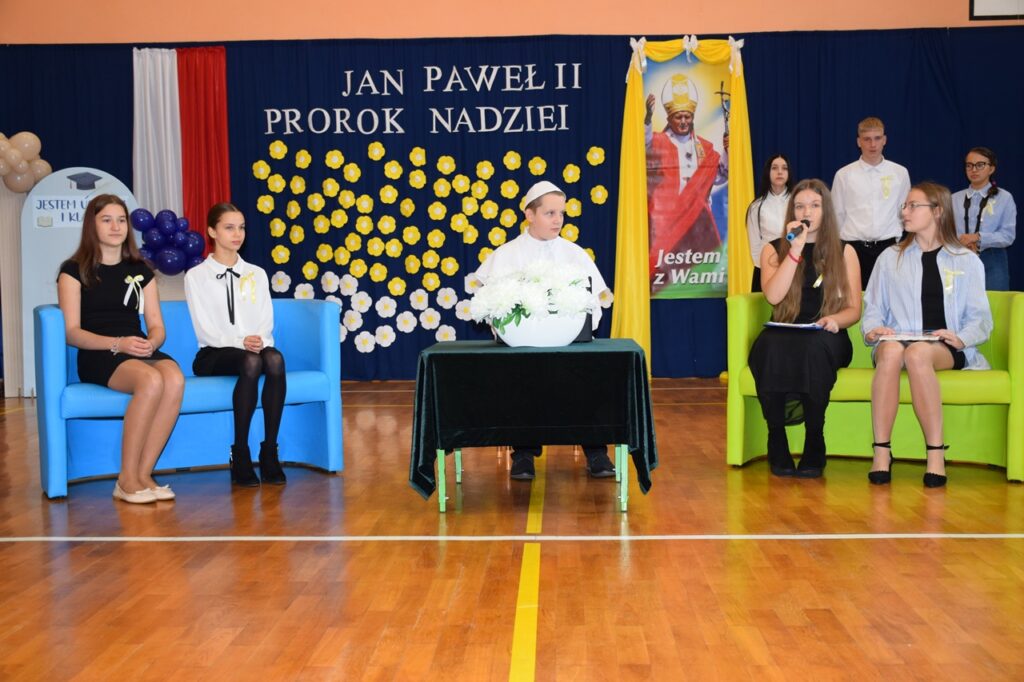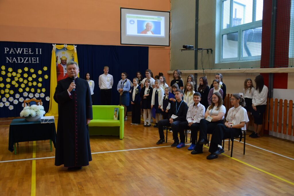 17 października 2025 roku w Szkole Podstawowej im. św. Jana Pawła II w Kluczewsku odbyła się wyjątkowa uroczystość – Dzień Patrona Szkoły połączony z pasowaniem uczniów klasy pierwszej. Na początku pani Dyrektor serdecznie powitała przybyłych gości. Następnie głos zabrał ksiądz proboszcz Wiesław Chęcina, który w swoim wystąpieniu nawiązał do postaci św. Jana Pawła II, podkreślając znaczenie jego nauczania i wartości, które stanowią fundament wychowania w naszej szkole. Po tym wprowadzeniu rozpoczęła się część artystyczna przygotowana przez uczniów klas starszych. Tym razem miała ona formę programu telewizyjnego – wywiadu z Janem Pawłem II. Młodzi reporterzy rozmawiali z nim o jego życiu, dzieciństwie, pasjach i wartościach. Dzięki temu wszyscy obecni mogli lepiej poznać postać naszego Patrona i przypomnieć sobie, jak ważne miejsce w jego nauczaniu zajmowały dzieci i młodzież. Następnie uczniowie klasy pierwszej przy dźwiękach poloneza z dumą wkroczyli na salę. Zaprezentowali krótkie wypowiedzi o tym, co dla nich znaczy bycie uczniem, a potem z radością zaśpiewali piosenkę o szkole. Po występie nastąpiło wprowadzenie pocztu sztandarowego. Wszyscy zebrani odśpiewali hymn szkoły, a pierwszoklasiści złożyli uroczyste ślubowanie, obiecując pilnie się uczyć, być dobrymi kolegami i godnie reprezentować swoją szkołę. Najważniejszym momentem uroczystości był akt pasowania na ucznia, którego dokonała pani Dyrektor symbolicznym ołówkiem wręczając uczniom legitymacje szkolne. Przewodnicząca Rady Rodziców p. Małgorzata Kowalczyk przekazała okolicznościowe dyplomy, a pani bibliotekarka Małgorzata Walasek obdarowała dzieci książkami na pamiątkę tego wyjątkowego dnia. Rodzice również włączyli się w ten ważny dla ich pociech moment – przygotowali słodkie upominki w ozdobnych tubach. Nie zabrakło również serdecznego powitania ze strony uczniów klasy drugiej, którzy zapewnili swoich młodszych kolegów o przyjaźni i gotowości do pomocy w szkolnych sprawach. Na zakończenie wręczyli im – za pośrednictwem wychowawczyni – drobne upominki.