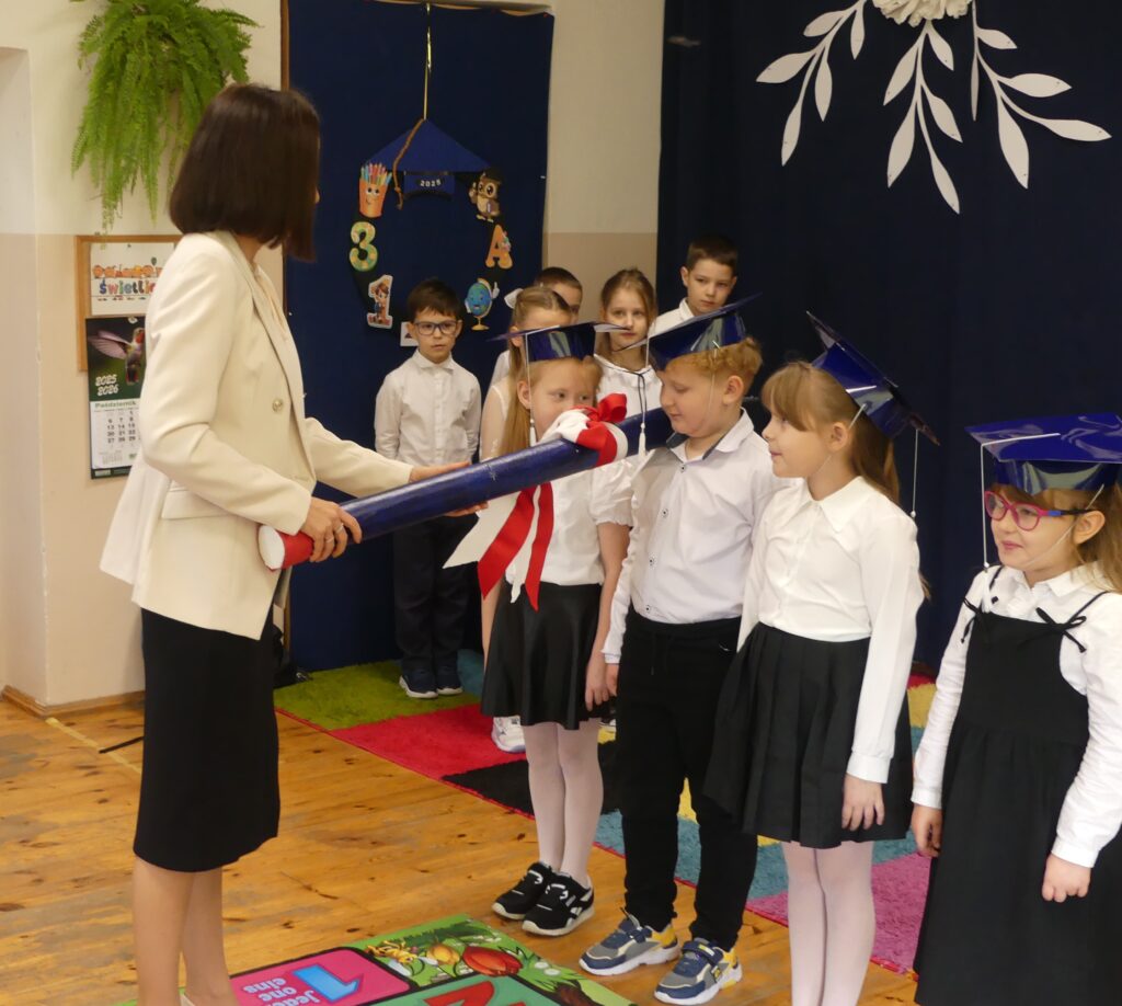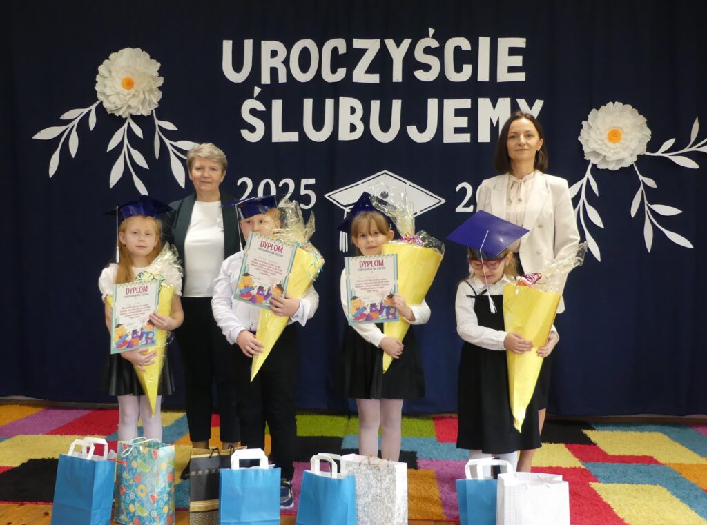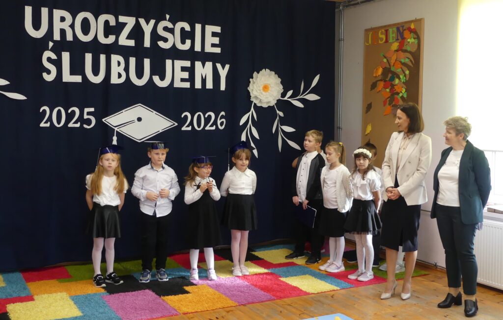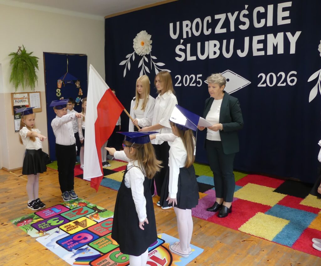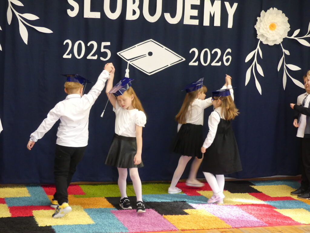 Uroczystość rozpoczęła się występem przygotowanym wspólnie z uczniami kl. 2 i 3. Następnie odbyło się ślubowanie na flagę, podczas którego uczniowie obiecali dbać o dobre imię swojej klasy i szkoły. Pani Wicedyrektor dokonała pasowania, dotykając ramienia każdego ucznia i wypowiadając słowa: “Pasuję Cię na ucznia klasy pierwszej”. Na koniec dzieci otrzymały dyplomy oraz upominki. Po części oficjalnej wszyscy udali się na wspólny poczęstunek.